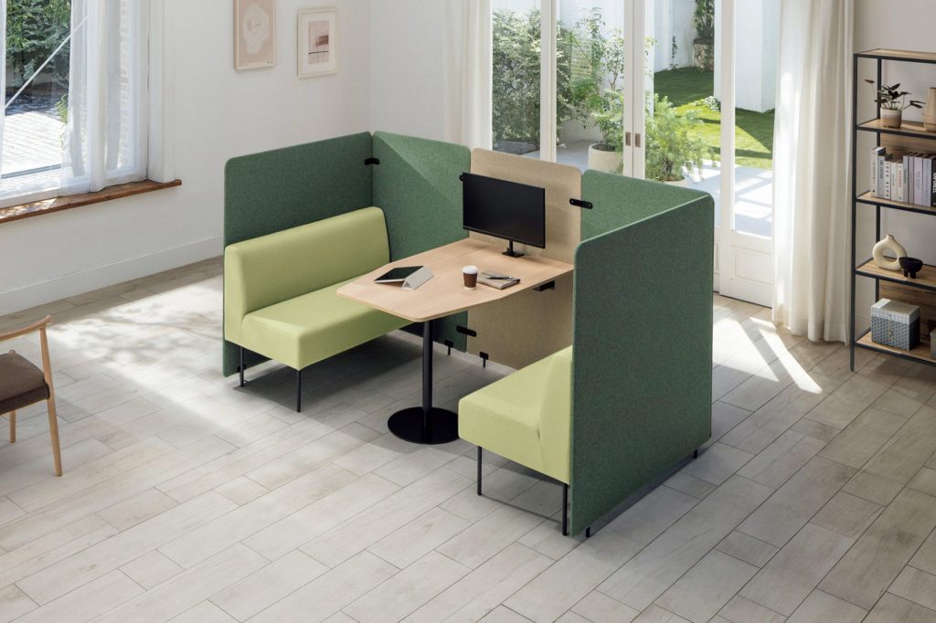 ユニットソファーとディスプレイを組み合わせたオープンスペースから、背面パネルを活かして空間を仕切ったセミクローズドスペース、三方を囲んだミーティング用ブースまで、用途に合わせた幅広いシーンに対応するといいます。さまざまな空間を統一感のあるカラーリングでコーディネート可能だとしています。
