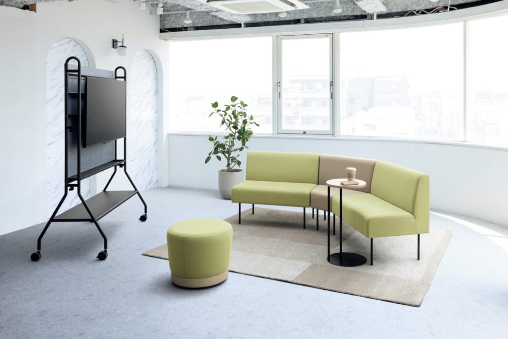 MELIOシリーズに、パネルなしのユニットソファーを加え、リニューアルしたといいます。新たに追加した「台形タイプ」を間に挟んで組み合わせることで、ゆるやかな角度のラウンド形状に。ディスプレイが見やすく、会話もしやすいレイアウトが可能だとしています。