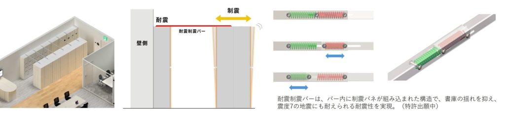 耐震制震バーは、バーと門型のレイアウトを組み合わせることで書庫の「転倒防止」と「揺れを抑える」機能を備えたオフィス向けの防災商品だといいます(※)。バー内に制震バネを組み込んだ構造により、書庫の揺れを抑え、震度7相当の地震にも耐えることができる耐震性を備えているため、設置によりオフィスの安全性を高めるとしています。